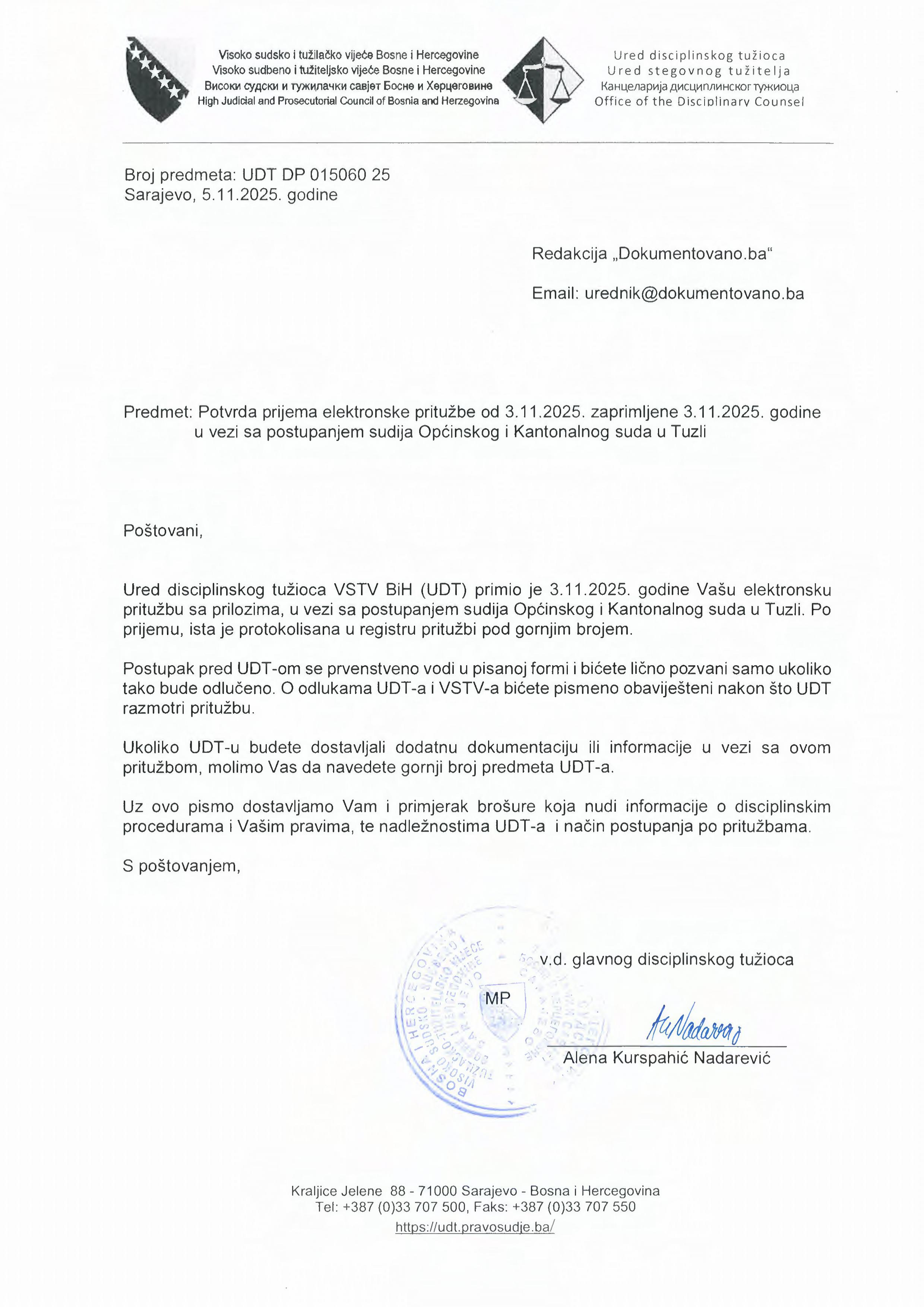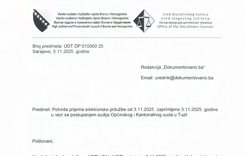 Sarajevo, 5. novembar 2025. – Visoko sudsko i tužilačko vijeće Bosne i Hercegovine (VSTV BiH) zvanično je registriralo predmet disciplinskog karaktera pod brojem UDT DP 015060 25, nakon što je Ured disciplinskog tužioca (UDT) potvrdio prijem prijave Redakcije Dokumentovano.ba od 3. novembra 2025. godine, u vezi sa postupanjem sudija Općinskog i Kantonalnog suda u Tuzli.