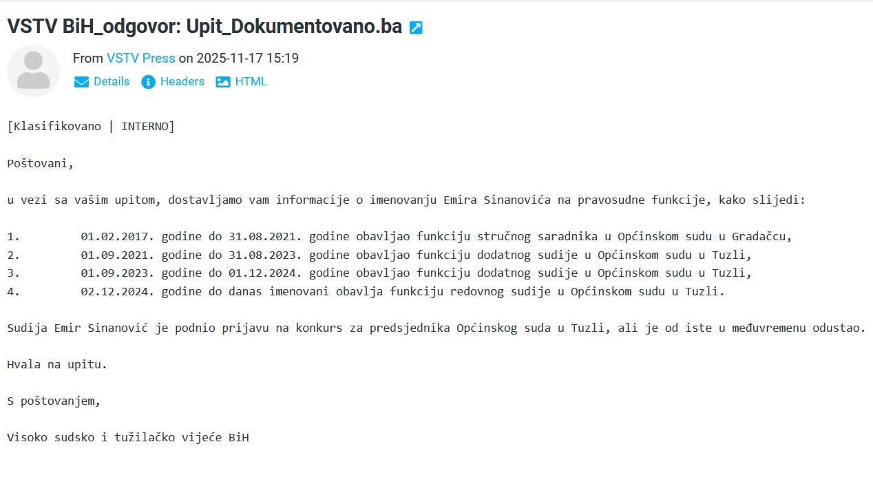 Visoko sudsko i tužilačko vijeće BiH (VSTV) dostavilo je 17.11.2025. Dokumentovano.ba zvaničnu informaciju o statusu sudije Emira Sinanovića, u kojoj se potvrđuju ključne činjenice koje smo mjesecima iznosili.