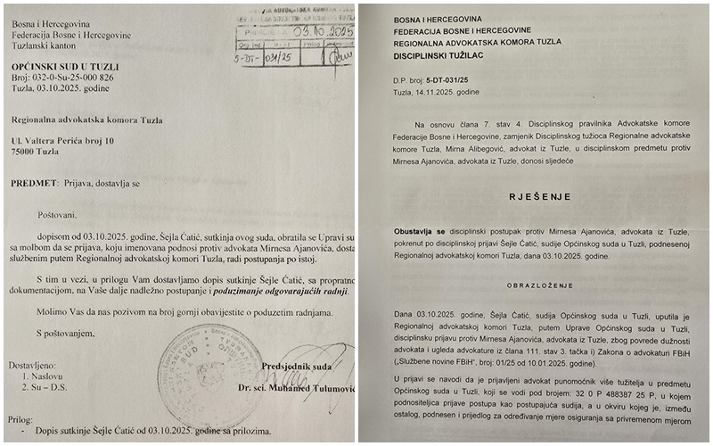 - Dana 3. oktobra potpisuje privatnu prijavu sudije Šejle Ćatić i službeni akt potpisuje kao predsjednik Općinskog suda Tuzla i dostavlja Regionalnoj advokatskoj komori Tuzla (Napomena: ta disciplinska prijava protiv advokata Mirnesa Ajanovića je odbačena kao neosnovana – link: https://dokumentovano.ba/2025/11/21/disciplinska-prijava-sudije-protiv-advokata-mirnesa-ajanovica-odbacena-advokatska-komora-utvrdila-potpunu-neosnovanost-prijave-sudije-sejle-catic/