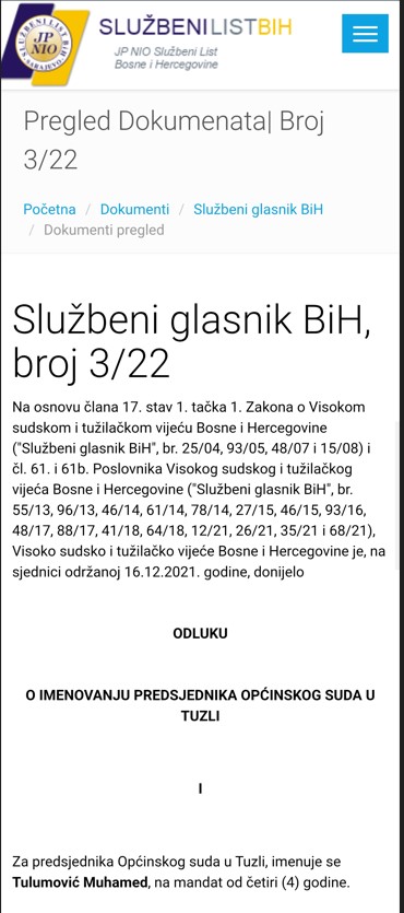 DRUGA TAČKA PRIJAVE – RUŠI DECENIJSKI SISTEM – MUHAMED TULUMOVIĆ NIKADA NIJE BIO SUDIJA OPĆINSKOG SUDA TUZLA – ŠTO JE BIO OSNOVNI USLOV ZA IZBOR PREDSJEDNIKA SUDA