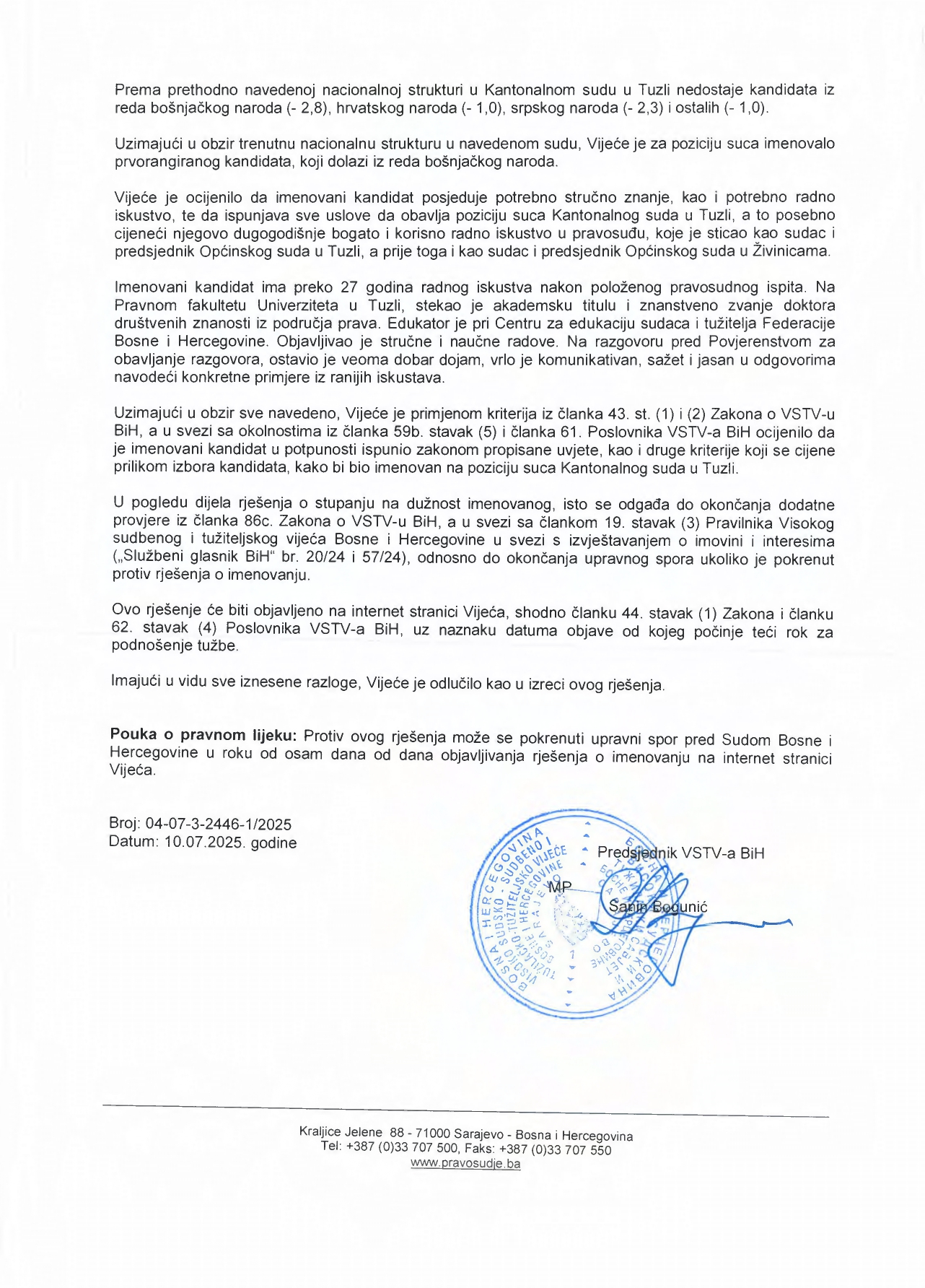 Radi se o citatu iz službenog obrazloženja Rješenja o imenovanju sudije Kantonalnog suda u Tuzli, broj: 04-07-3-2446-1/2025, od 10.07.2025. godine, u kojem VSTV BiH navodi da je:
