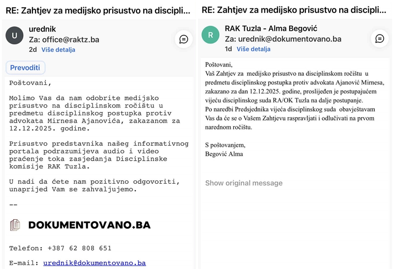 Naravno, čim sam vidio kako izgleda „postupanje“ i o čemu se radi, a što ste i vi vidjeli u ovih desetak tekstova Feljtona – podnio sam uredan zahtjev Regionalnoj advokatskoj komori Tuzla da kao urednik Dokumentovano.ba prisustvujem i snimim ročište.
