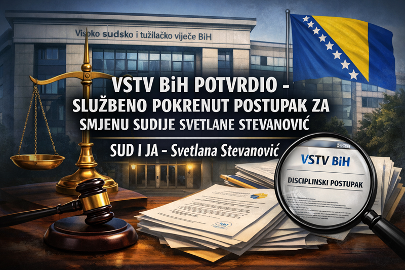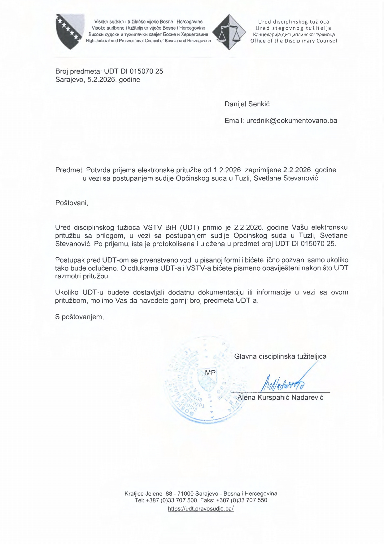 Visoko sudsko i tužilačko vijeće BiH zvanično je obavijestilo portal Dokumentovano.ba da je zaprimljena pritužba, koja sadrži tekstove Feljtona „SUD I JA – Svetlana Stevanović“, objavljivane svakodnevne od 28.11.2025. godine, a odnosi se na devijantno postupanje sutkinje Svetlane Stevanović, te da je ista protokolisana u predmetu UDT DI 015070 25.