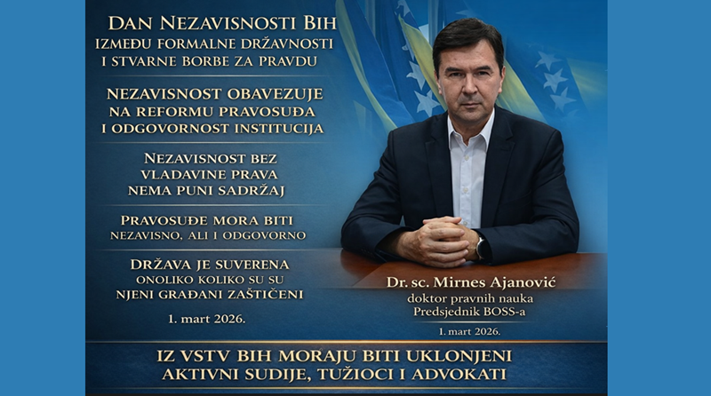 Dr. sc. Mirnes Ajanović, doktor pravnih nauka i predsjednik BOSS-a, povodom Dana nezavisnosti Bosne i Hercegovine ističe da nezavisnost nije završena historijska činjenica, već trajna obaveza da se izgradi država u kojoj institucije štite građane, a ne interese pojedinaca.