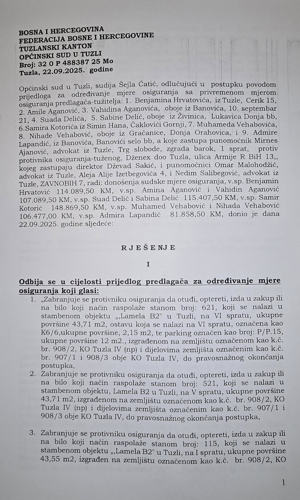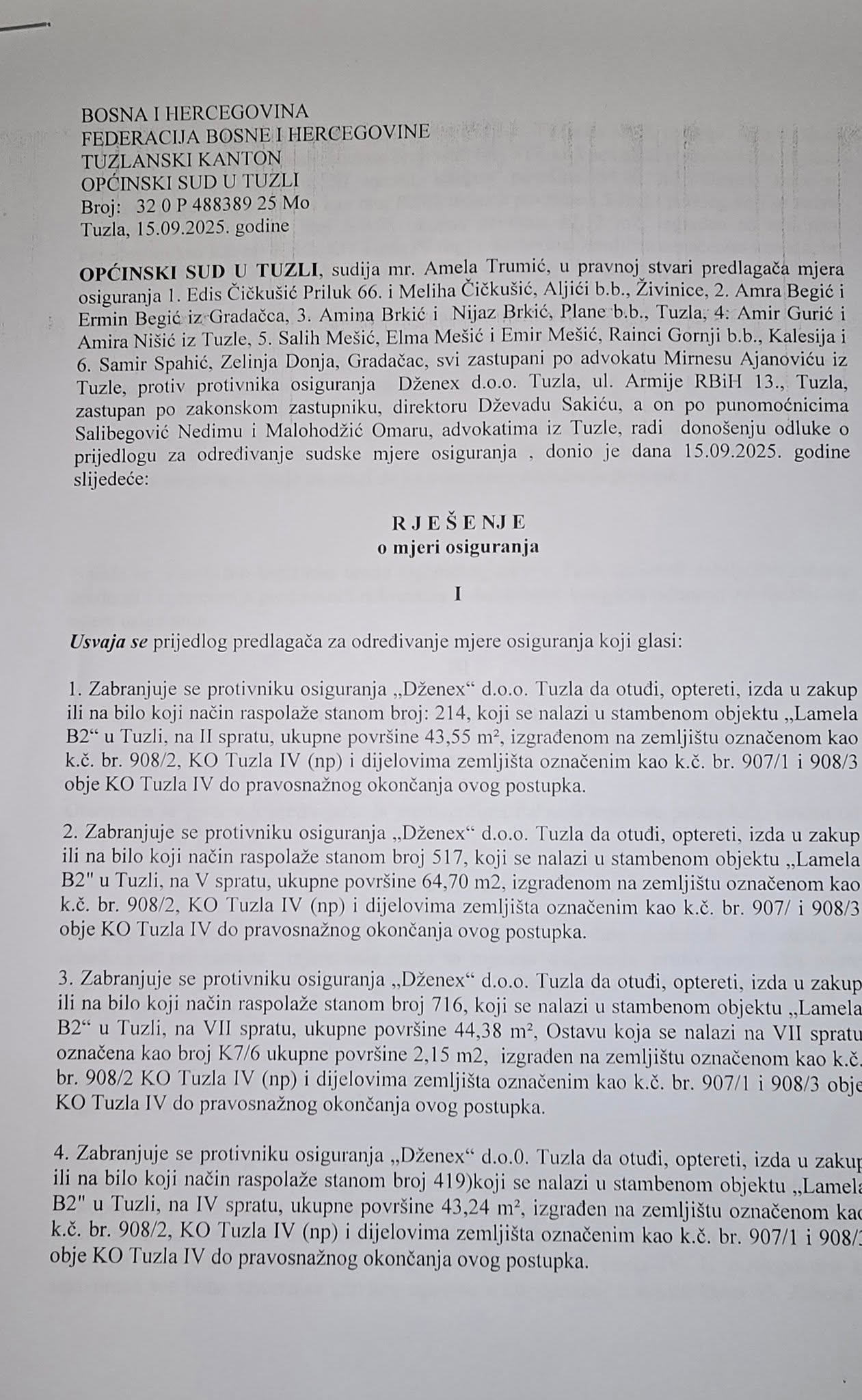 U predmetu kupaca stanova u zgradi „Lamela B2“ u Tuzli, desio se najveći pravosudni skandal! Šest sudija Općinskog suda u Tuzli donijelo je prije dva mjeseca identične odluke po privremenim mjerama osiguranja – svi su utvrdili da kupci imaju pravo na zaštitu i da se Dženexu zabrani raspolaganje stanovima zabranom prodaje stanova do konačne presude kojom se traži ulazak u posjed kupljenih stanova.