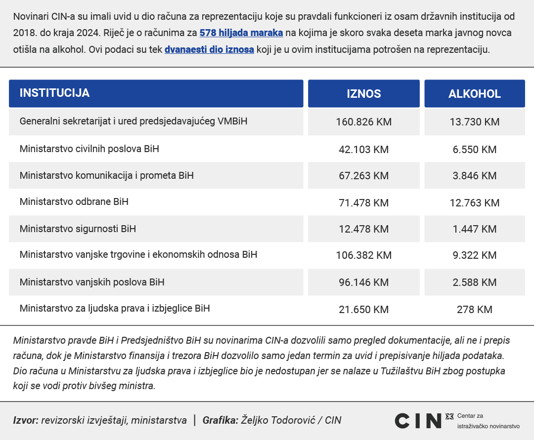 Novinari CIN-a su imali uvid u manji dio ovih računa – iznos od 578 hiljada maraka – koji svjedoče da se novac za reprezentaciju u Vijeću ministara značajnim dijelom troši na alkohol u kafanama i restoranima širom zemlje i u inostranstvu, a pravda kao utrošak na sastancima sa saradnicima, radnim ručkovima ili zvaničnim večerama.